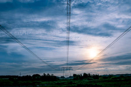 power transmission lines. electrical poles and wires. high-voltage power lines at sunset, high voltage electric transmission tower. High Voltage towers provide power supply over a long distance.