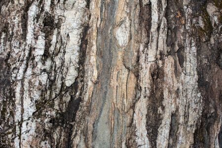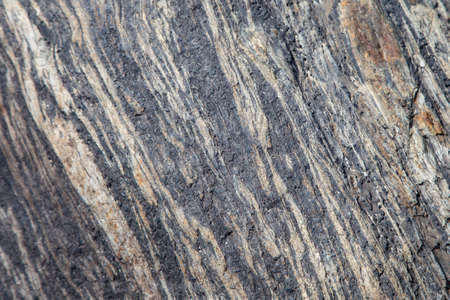 Close up of rock surface, gneiss with white folded quartz veins due to the power of geologic crustal movement
