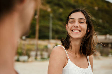 Portrait of a girl. A woman with long hair walks down the street. Beautiful brunette.