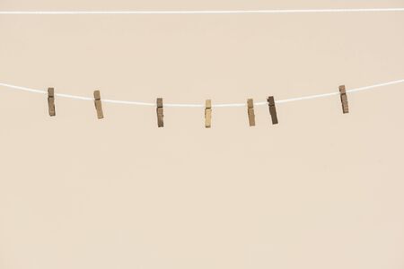 An empty clothespin on a rope isolated on light background with copy space.