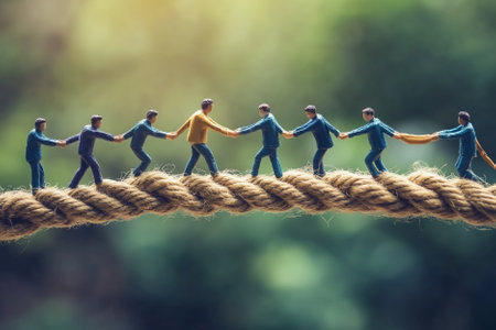 Miniature people : Businessmen walking on rope in teamwork concept.