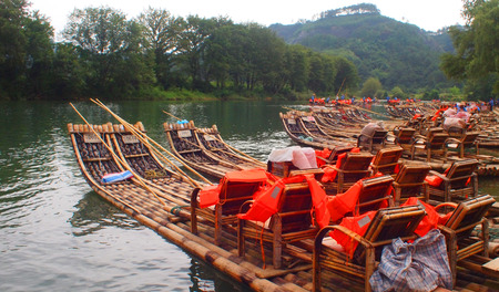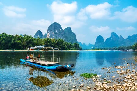 Yangshuo, China - August 2019 : Image of a ferry boat waiting for passengers on the shore of the Li river in summer
