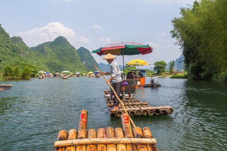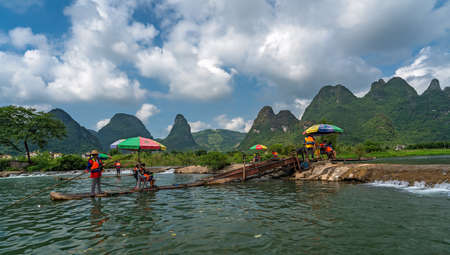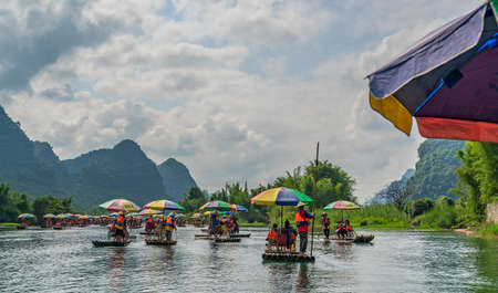 Yangshuo, China - August 2019 : Tourists sitting on bamboo rafts steered by guides with a long sticks on scenic and beautiful Yulong River