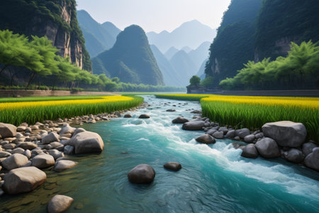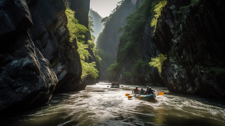 Men kayaking in the flowing water of a beautiful ravine generated by artificial intelligence