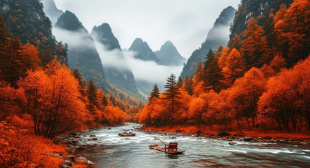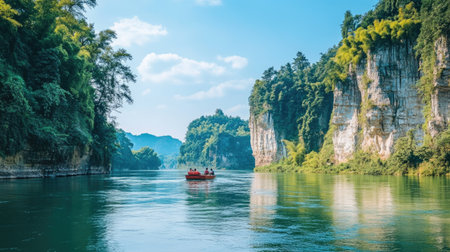 A boat peacefully glides down a river surrounded by towering mountains and lush greenery.