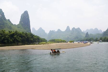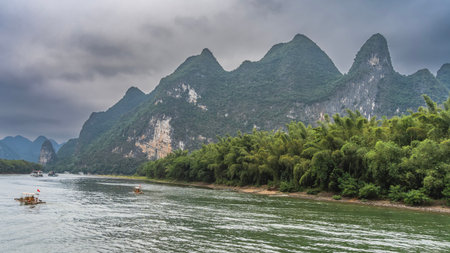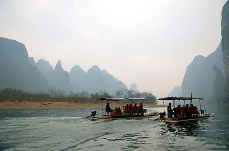 Bamboo rafts, tourist ships sail along the picturesque river. Ripples, reflections on the water. Lush green vegetation on the shore. Mountains against sky and clouds. China.