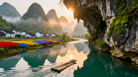 A serene bamboo raft floats on tranquil river surrounded by karst mountains