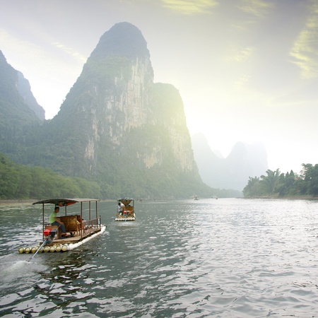 Bamboo rafting in the Yulong River surrounded by dramatic landscape of limestone karst.
