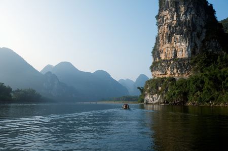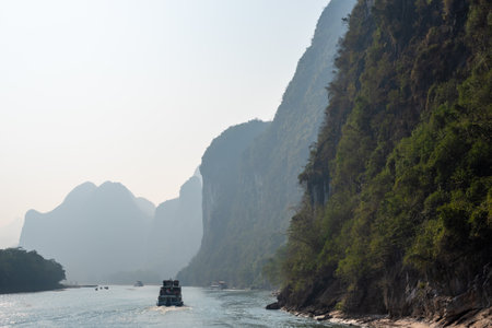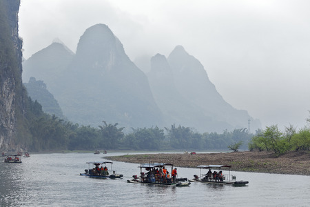 Boat on Li river cruise and karst formation mountain landscape in the fog between Guiling and Yangshuo, Guangxi province, China