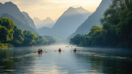A bamboo raft rests on the still waters of a lake, embraced by misty mountains. The serene atmosphere is highlighted by the soft morning light and distant hills.