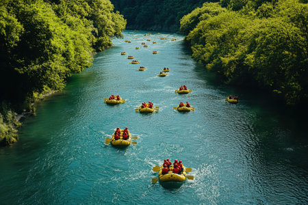Groups of adventurers navigate yellow rafts on a tranquil river, embraced by vibrant trees and summer sunlight.