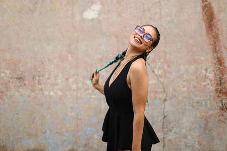 Portrait of a young beautiful girl in a black T-shirt on the background of a concrete wall