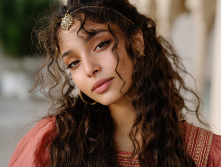 Curly-haired woman with ornate jewelry adorns her forehead, wearing a detailed red garment, looking directly at the camera. Her expression is serene and thoughtful