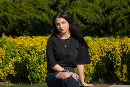 Portrait of a young girl in a park. Horizontal shot with natural light.