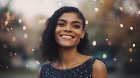 A woman with long flowing hair and a warm smile stands confidently surrounded by soft glowing lights. Her natural beauty radiates in this inviting atmosphere highlighting her cheerful demeanor.