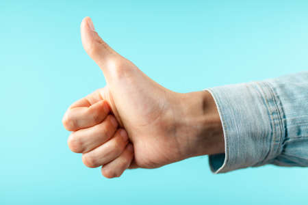 Hand with thumb up, like gesture. The concept of a positive sign, reaction. Hand on a blue background.