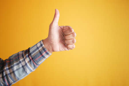 A male's hand making a thumb up sign on an orange background. Body language concept. Hand sign. Like gesture.