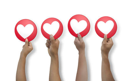 Close up on 4 arms of latin men and women coming out from below holding in hand a round red I LOVE icon on white background