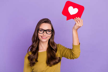 Photo of young lovely girl amazed omg hold paper pinata feedback choose blogging isolated over violet color background