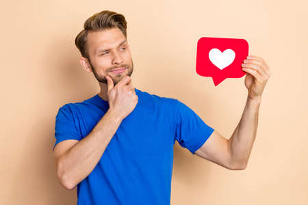 Photo of young guy hand touch chin look reaction icon button feedback idea isolated over beige color background