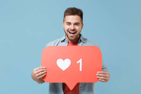Cheerful young bearded guy in casual shirt posing isolated on pastel blue background studio portrait. People lifestyle concept. Mock up copy space. Hold huge like sign from social network heart form.