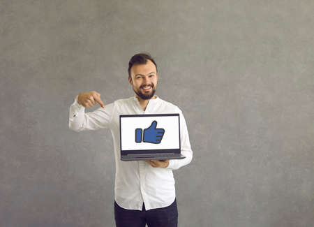 Studio portrait of happy social media network user and blogger asking to give him a like. Young man pointing at image of thumbs up on screen of laptop computer standing isolated on grey background
