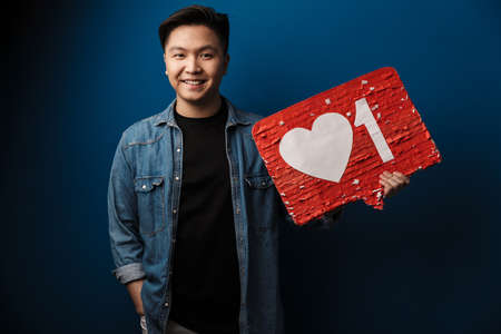Portrait of a cheerful young asian man wearing casual clothes standing isolated over blue background, showing like sign