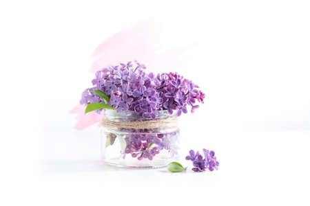 lilac flowers in a glass jar on the background of a watercolor brushstroke