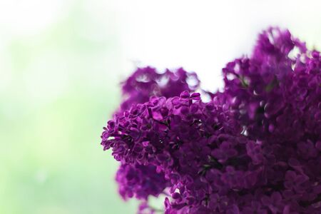 Fresh purple Lilac flowers on blurred bokeh background with selective focus. Colorful spring summer backdrop. Cotrasting colors, nature beauty banner copy space. Greeting card Mother's, Woman's day.