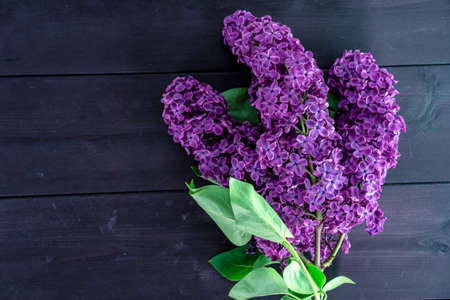 bouquet of purple lilac flowers on a blue wooden plank background. with space for posting information