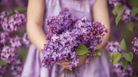 child's hands holding a bouquet of lilac flowers, embodying the joy of springtime.