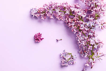Lilac flowers on pink paper. Floral greeting card with space for text. Purple lilac border top view, stylish beautiful spring image. Happy mothers day and Womens day concept.