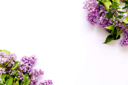 Spring flower. Beautiful branches of lilac on a white background. Copy space, flat, lay. Banner.