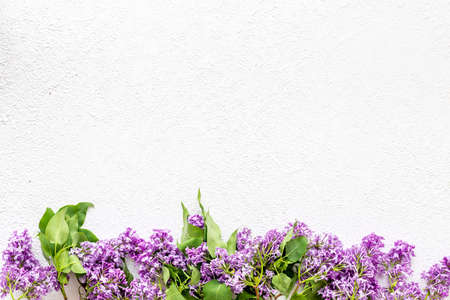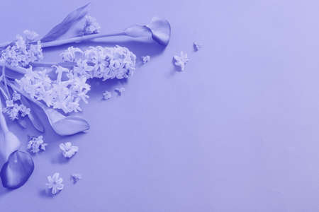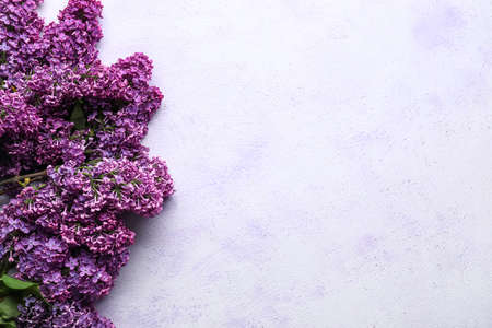 Beautiful vivid lilac flowers on light background. Flat lay spring time concept.