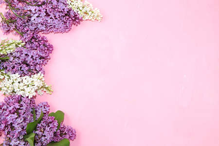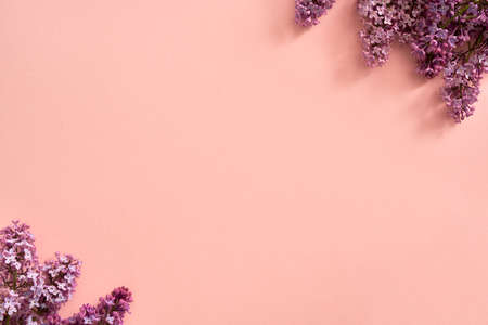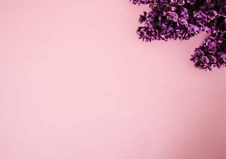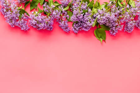 Lilac flowers on pink paper. Floral greeting card with space for text. Purple lilac border top view, stylish beautiful spring image. Happy mothers day and Womens day concept.