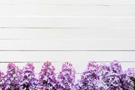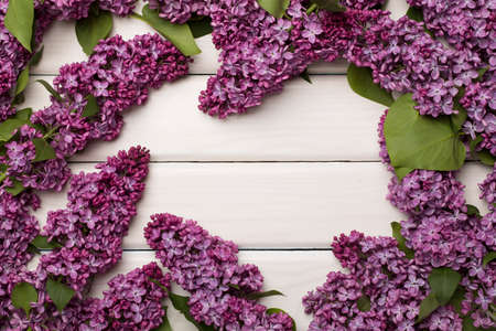 Lilac flowers floral background. Lilac flowers frame on vintage white wooden background. Top view flat lay
