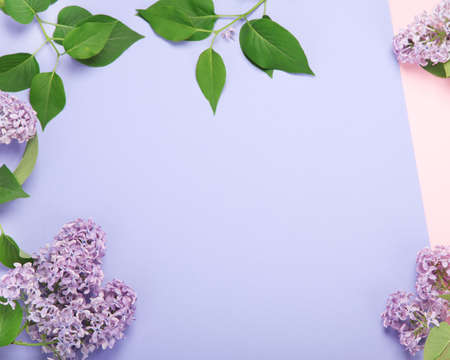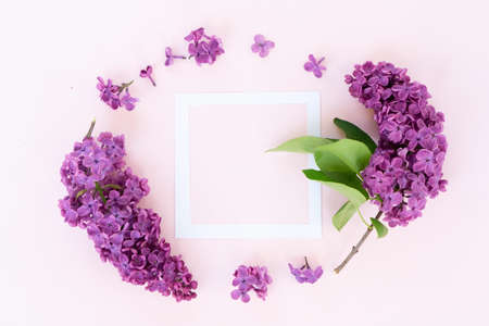A colored frame decorated with a lilac branch on a colored background of the copy space. Flat ley pink paper frame and lilac flowers