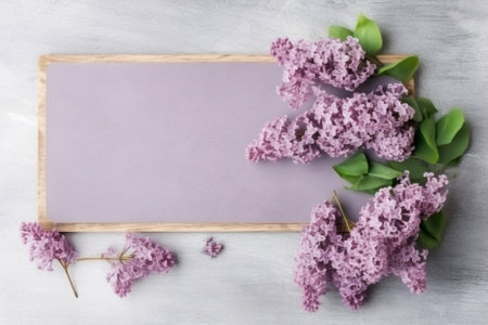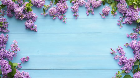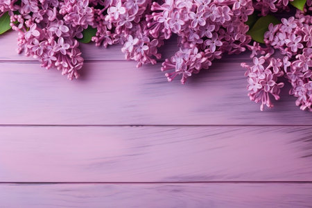 Lilac Flowers on Wooden Background: Spring Flat Lay. Generative AI