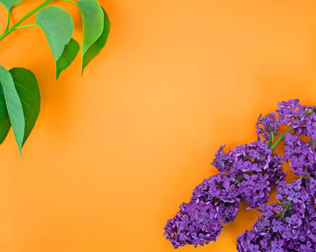 Lilac. A branch of purple lilac on a yellow background. Lilac blooming view from above. Spring, Plants and botany have come. Lilac is located from the bottom left. Flatly. Copy space for text.