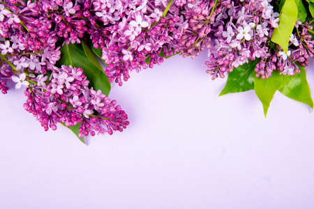 Lilac flowers closeup on tender violet background. Full frame. Spring flowers for birthday Mothers or Womens Day greeting card. Copy space. Wedding border