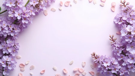 Soft lavender background with delicate lilac blooms and pink petals framing an empty central space