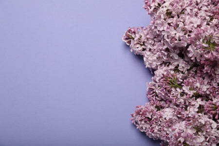 Beautiful lilac flowers on violet background, flat lay. Space for text