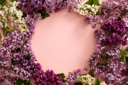 Spring pastel pink background with fresh lilac flowers with circular copy space