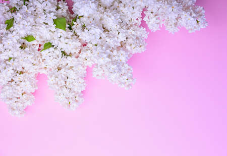 bouquet of blossoming white lilacs on a pink background, an empty space