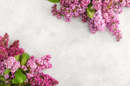 Blooming lilac flowers, spring border on grey concrete background, top view, copy space