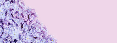 Lilac flowers closeup on tender violet background. Spring flowers for birthday Mothers or Womens Day greeting card. Copy space. Wedding border banner