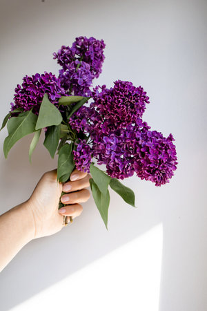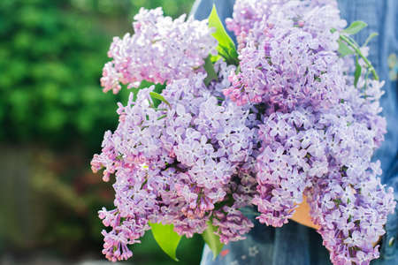 Hands of a woman in close-up with a bouquet of lilacs. Authenticity. Environmental friendliness. Content for a floral store. Sale of flowers.