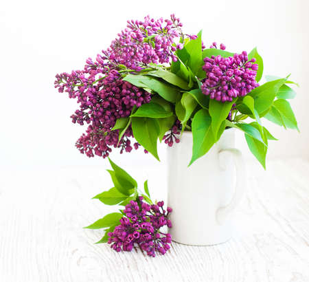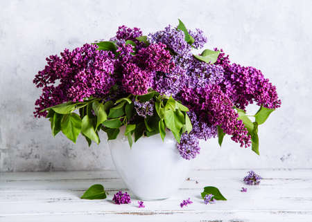 Bouquet of beautiful blooming lilacs in a white vase on a white wooden background. International Women's Day. Mother's day. Close up.