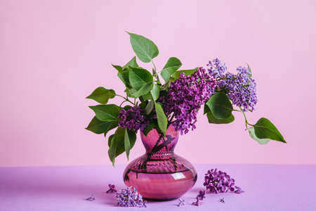 Bouquet of beautiful blooming lilacs in a pink vase on a pastel pink and purple background. International Women's Day. Mother's day. Close up.
