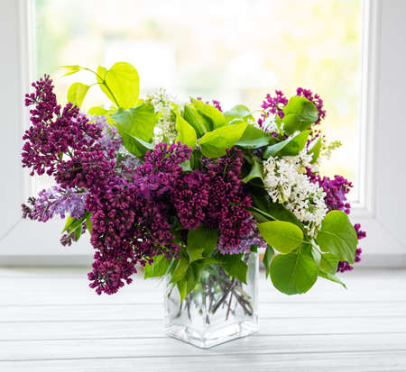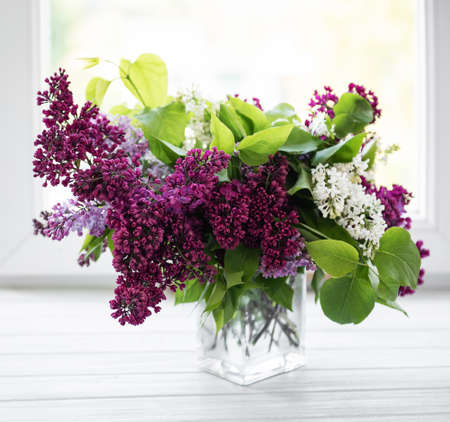 A bouquet of purple lilac in a glass vase. Springtime flowers.
